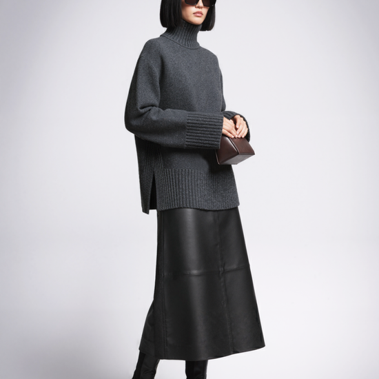 The High Neck Jumper is a loose-fitting, crafted piece made from a luxurious blend of cashmere and fine merino wool. It features ribbed detailing at the neck, waist, cuffs, and shoulders. Comfortable and easy to mix and match, it's the perfect everyday essential.