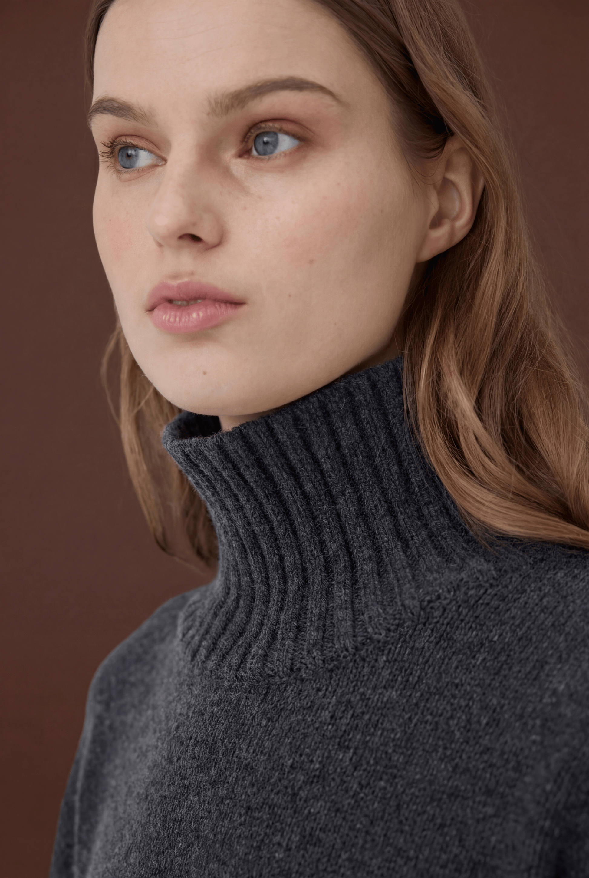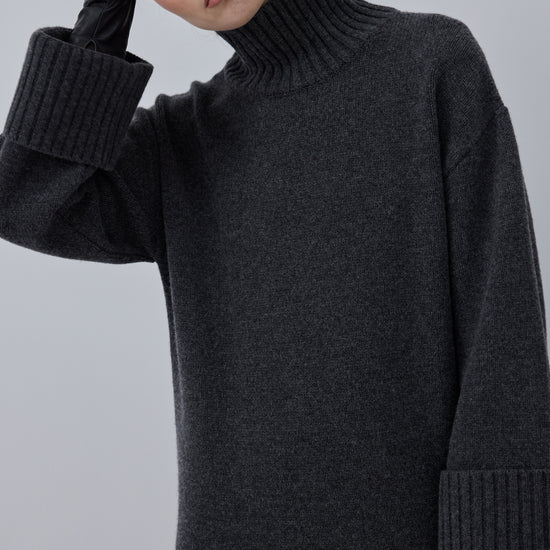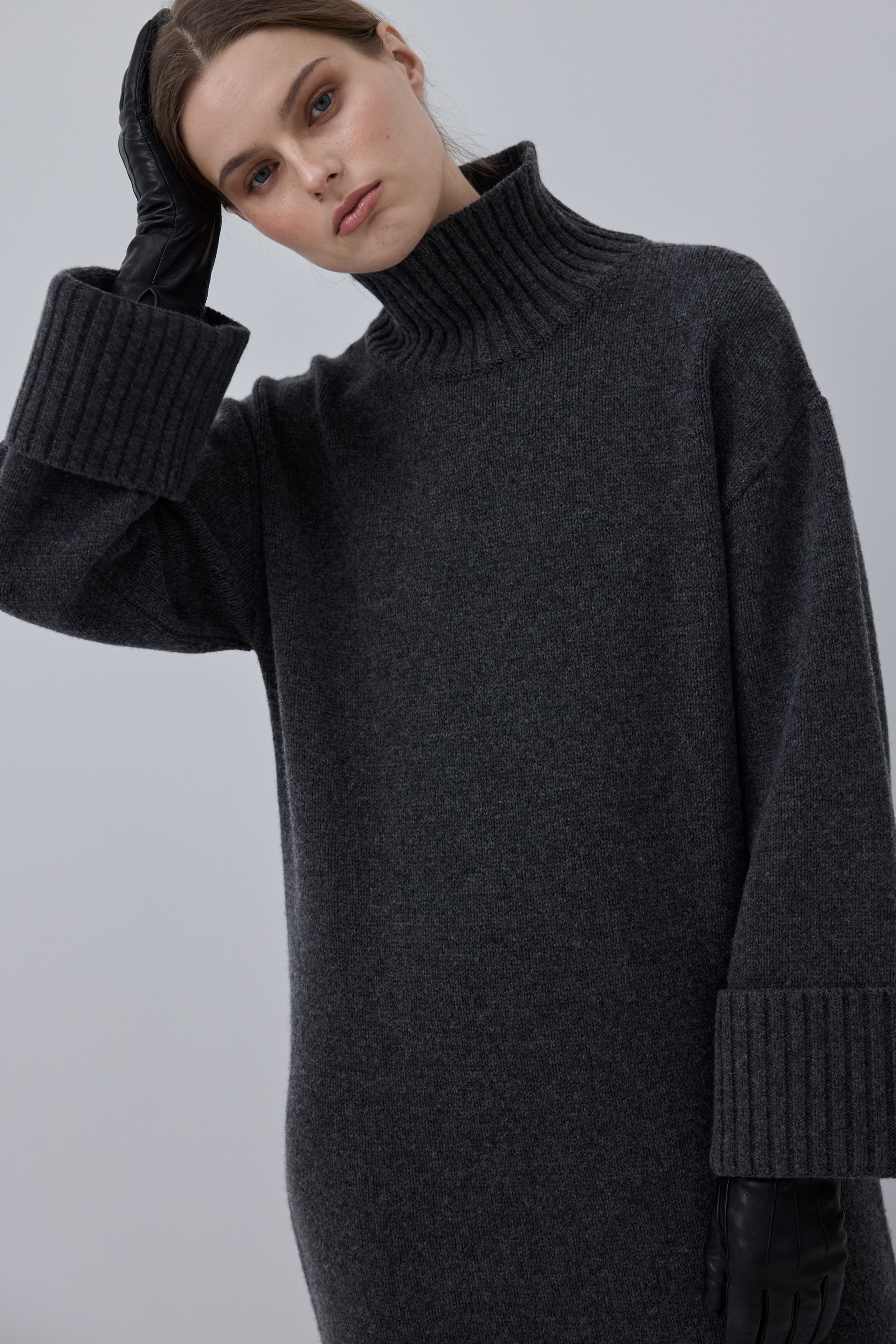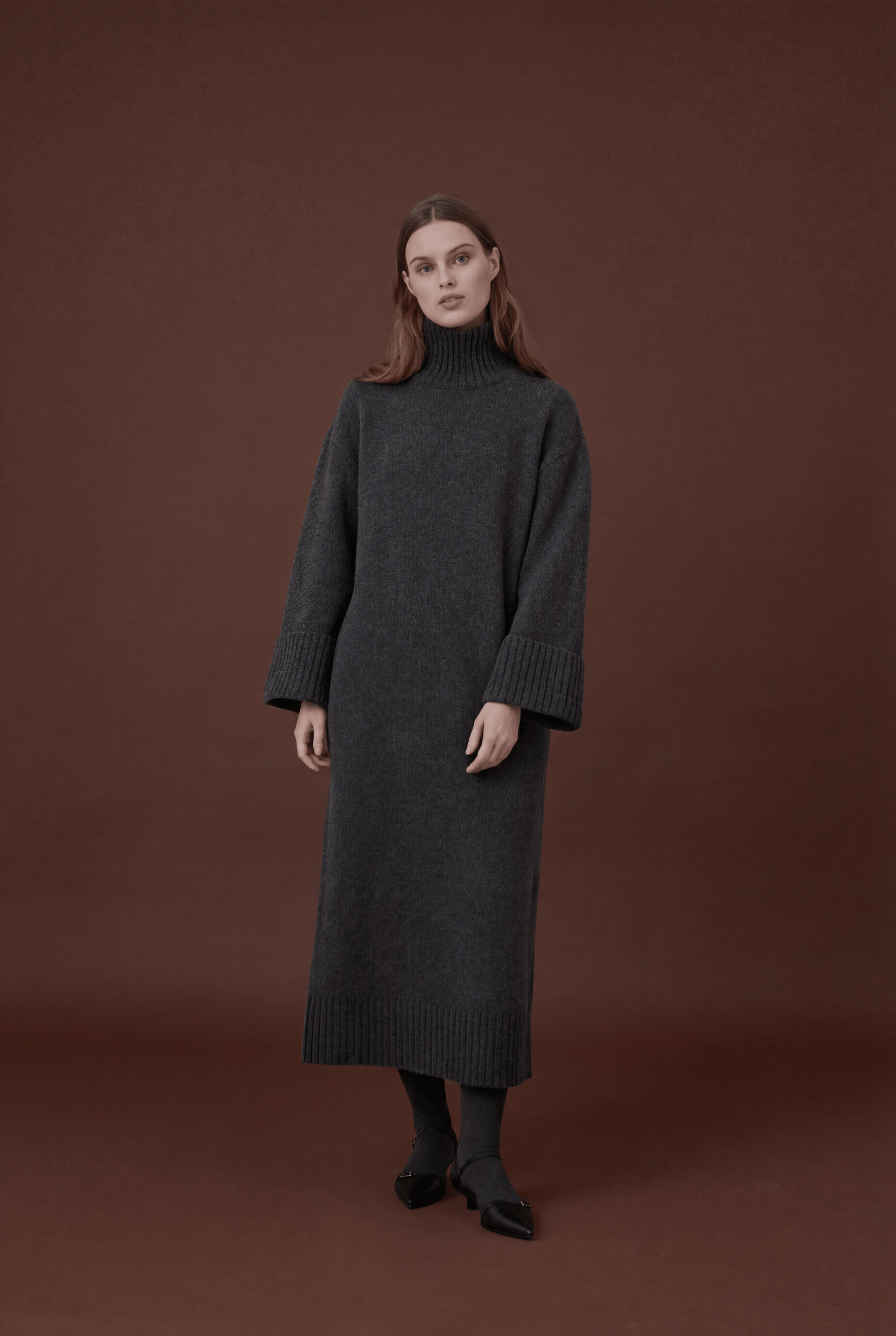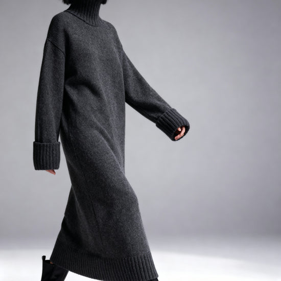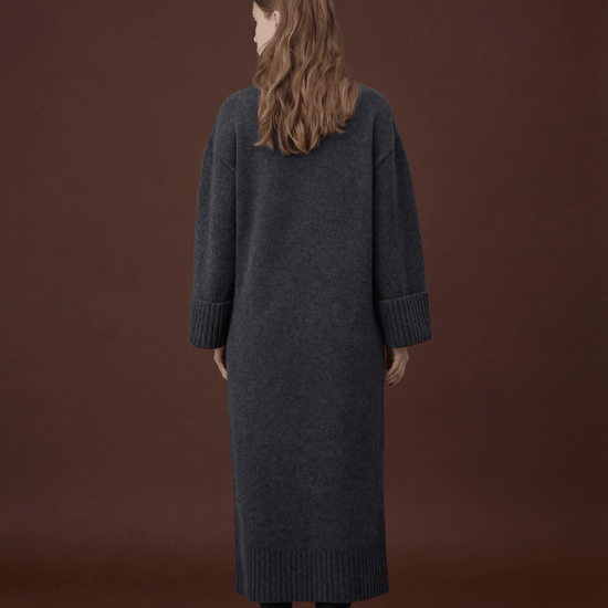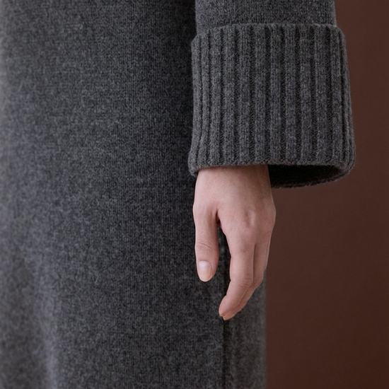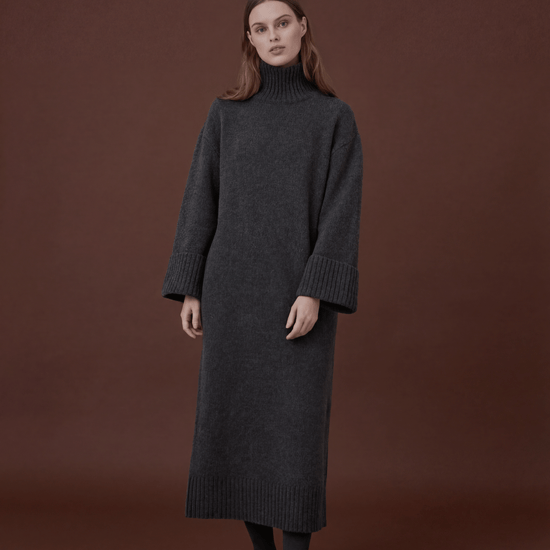 The Long Calf Dress is knitted from a luxurious blend of cashmere and fine merino wools, offering the perfect combination of warmth and comfort. Its soft, chunky texture ensures superior coziness, making it a timeless addition to your wardrobe.