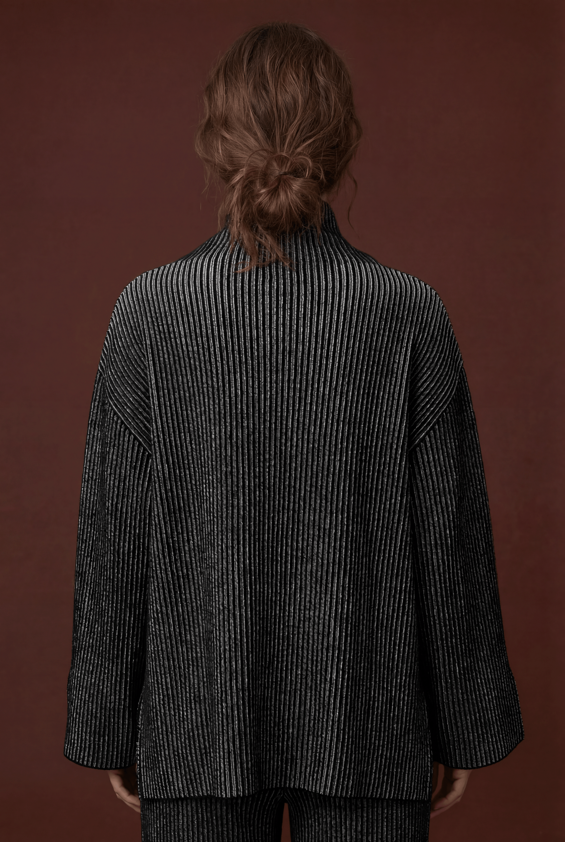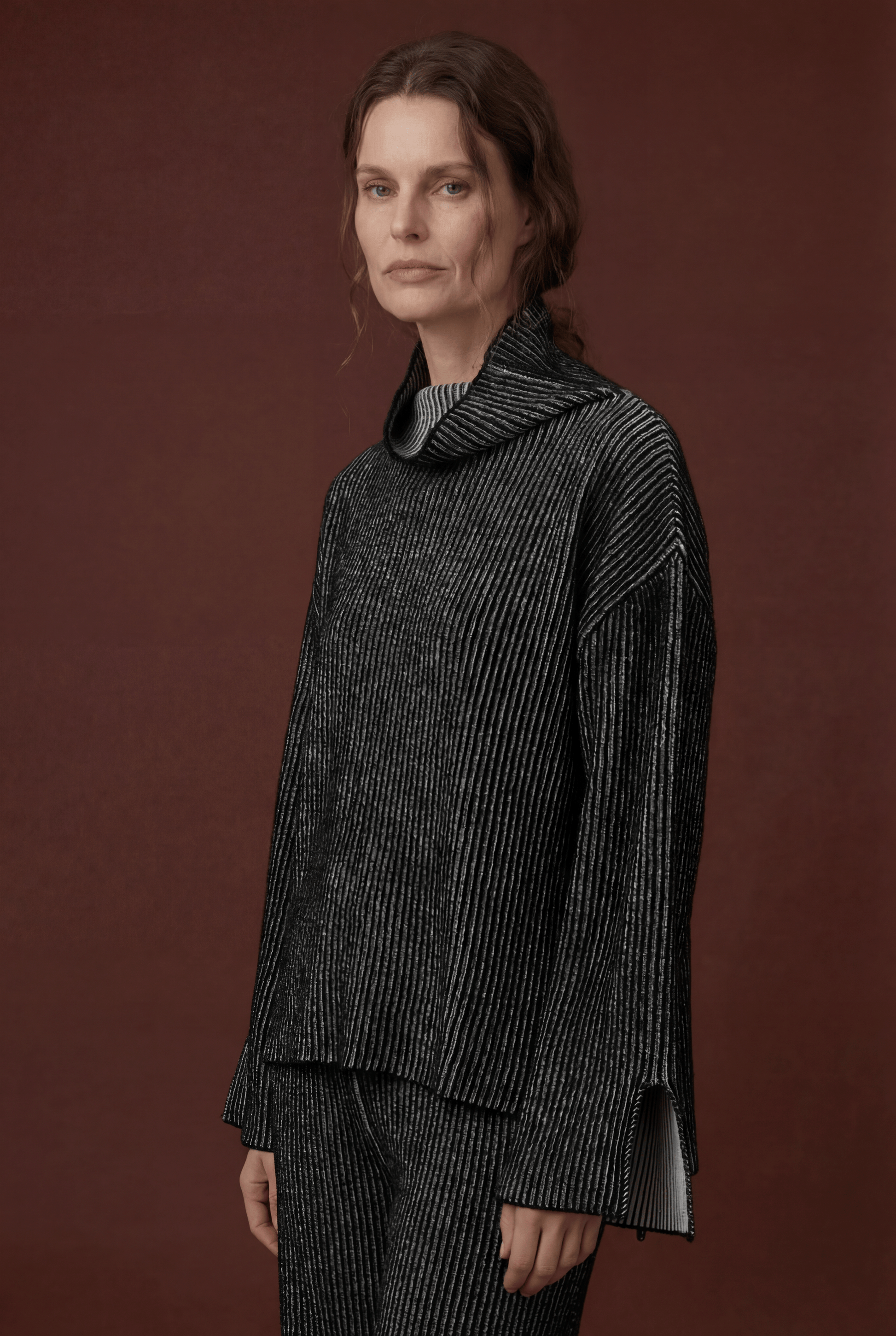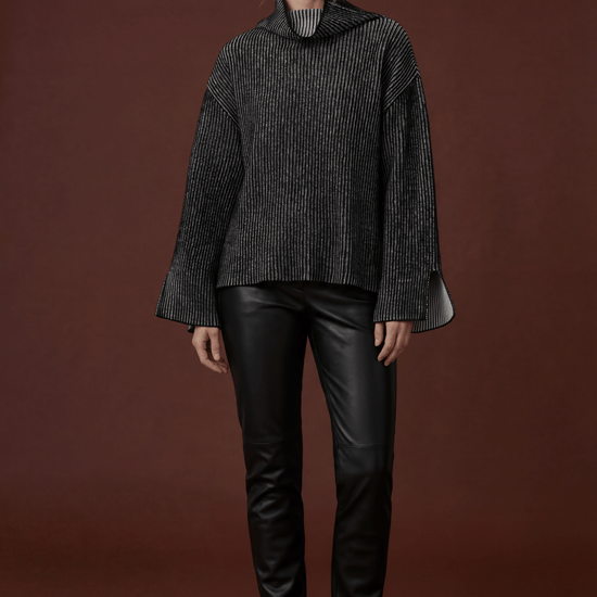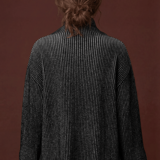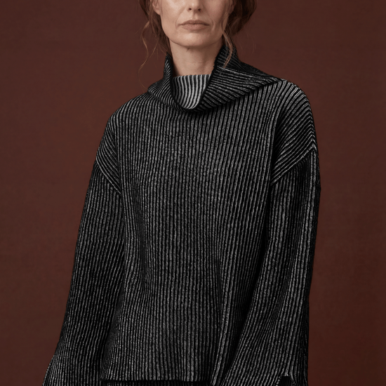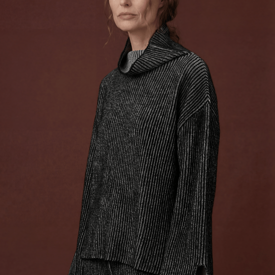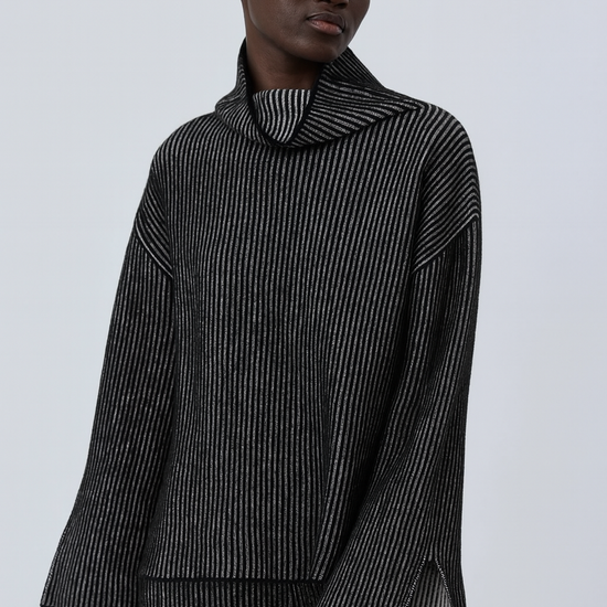 Oversized High-Neck Jumper knitted using the brioche technique. This piece features open slits at the bottom of the sleeves and body, offering added comfort and style. The double-sided design provides flexibility, allowing it to be worn on either side. For a seamless look, simply remove the care label from the side seam.