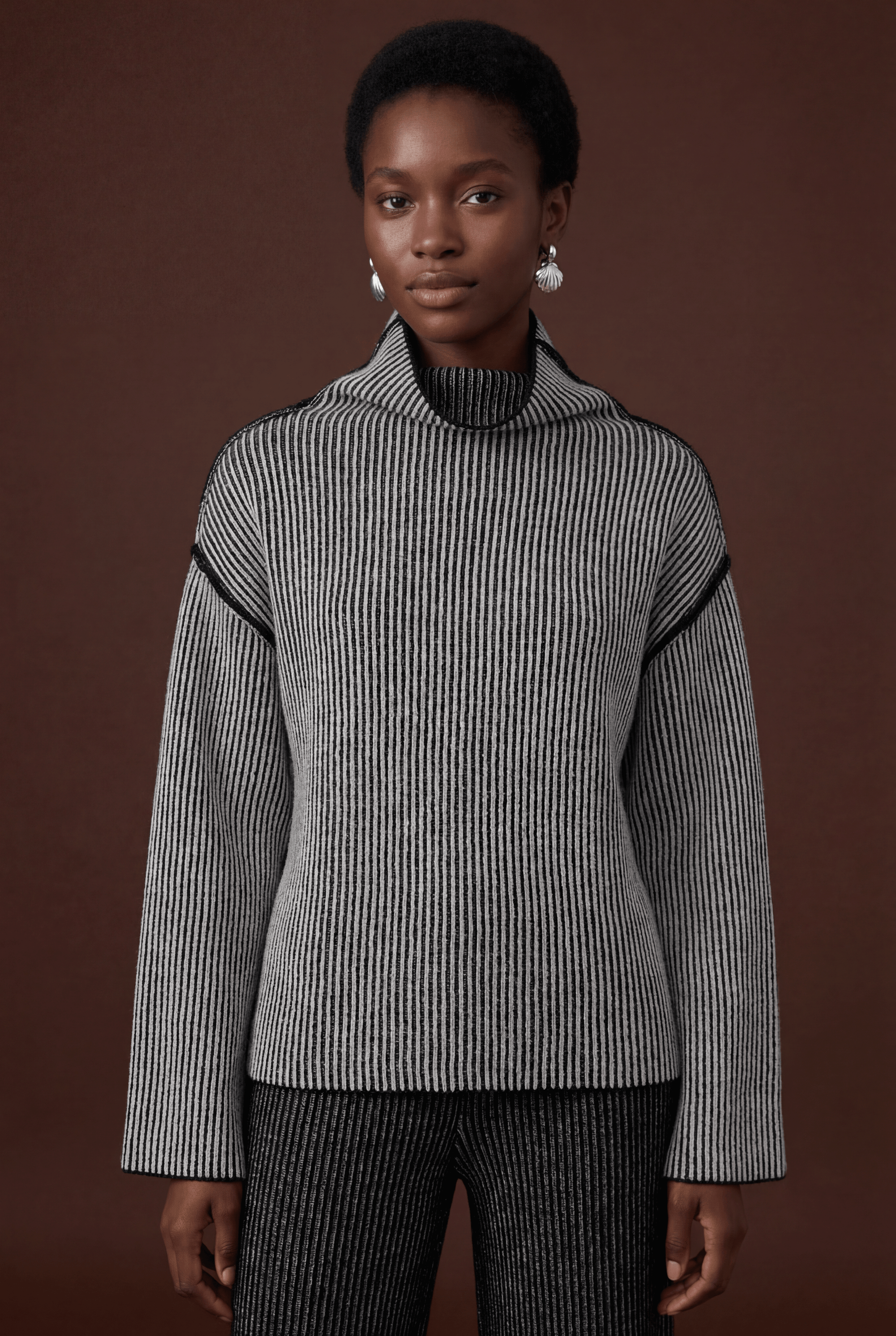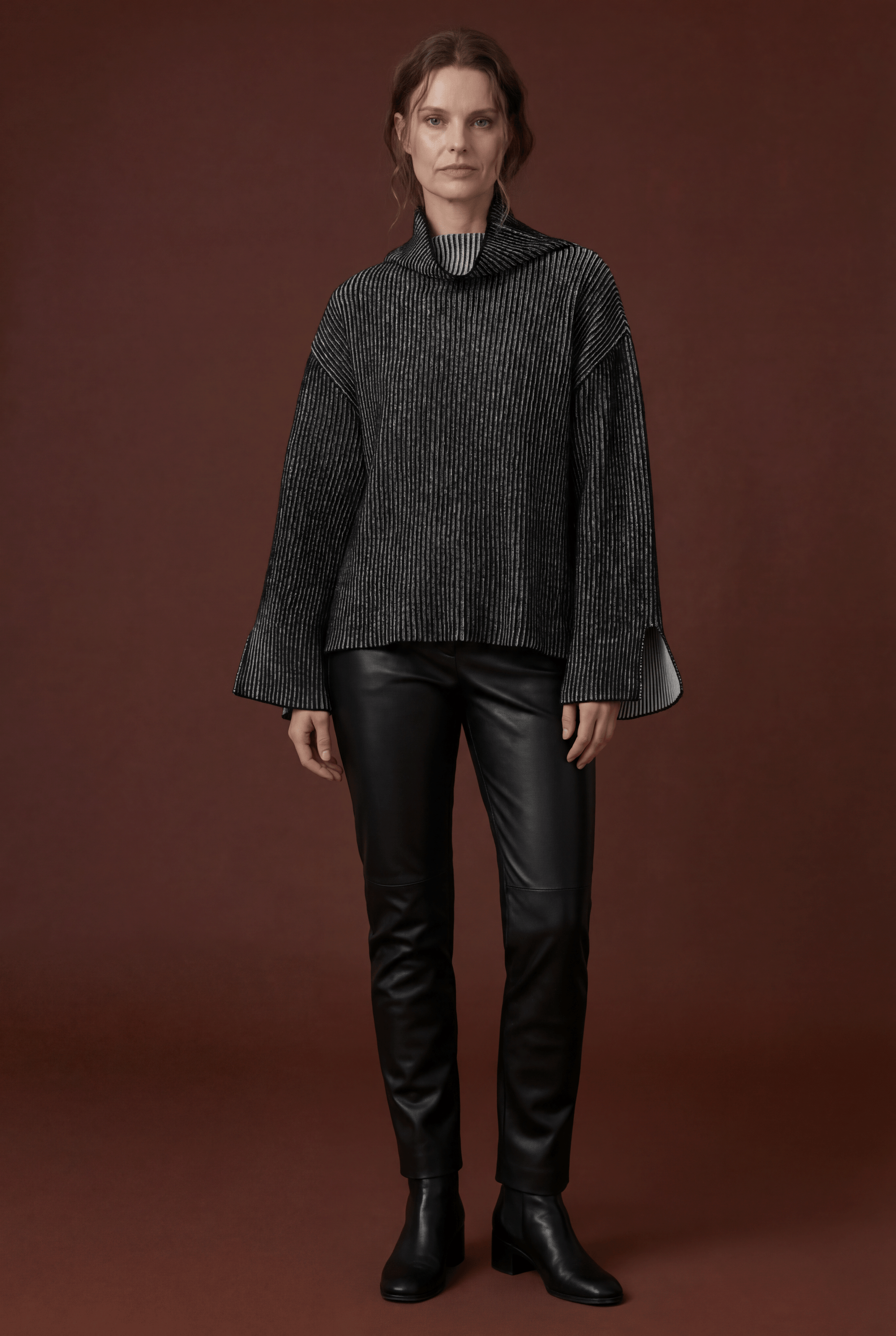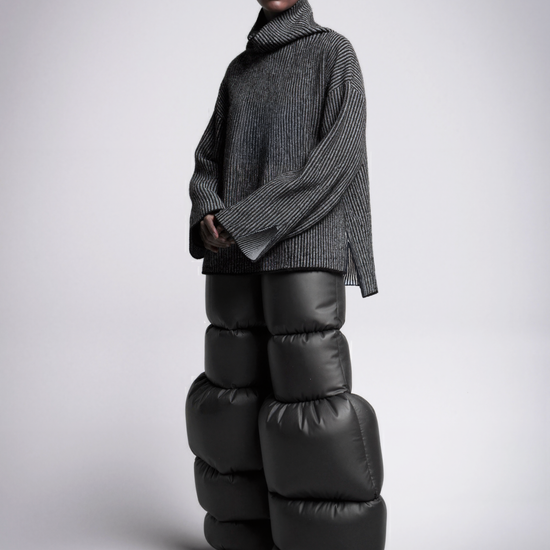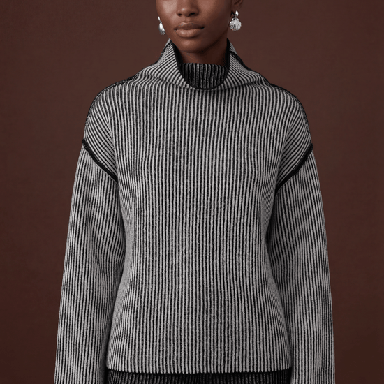 Oversized High-Neck Jumper knitted using the brioche technique. This piece features open slits at the bottom of the sleeves and body, offering added comfort and style. The double-sided design provides flexibility, allowing it to be worn on either side. For a seamless look, simply remove the care label from the side seam.